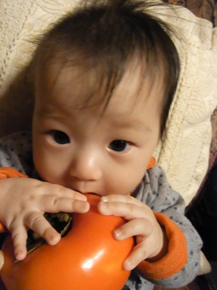 シャツの色と同じだったので、柿を持たせてみたら、